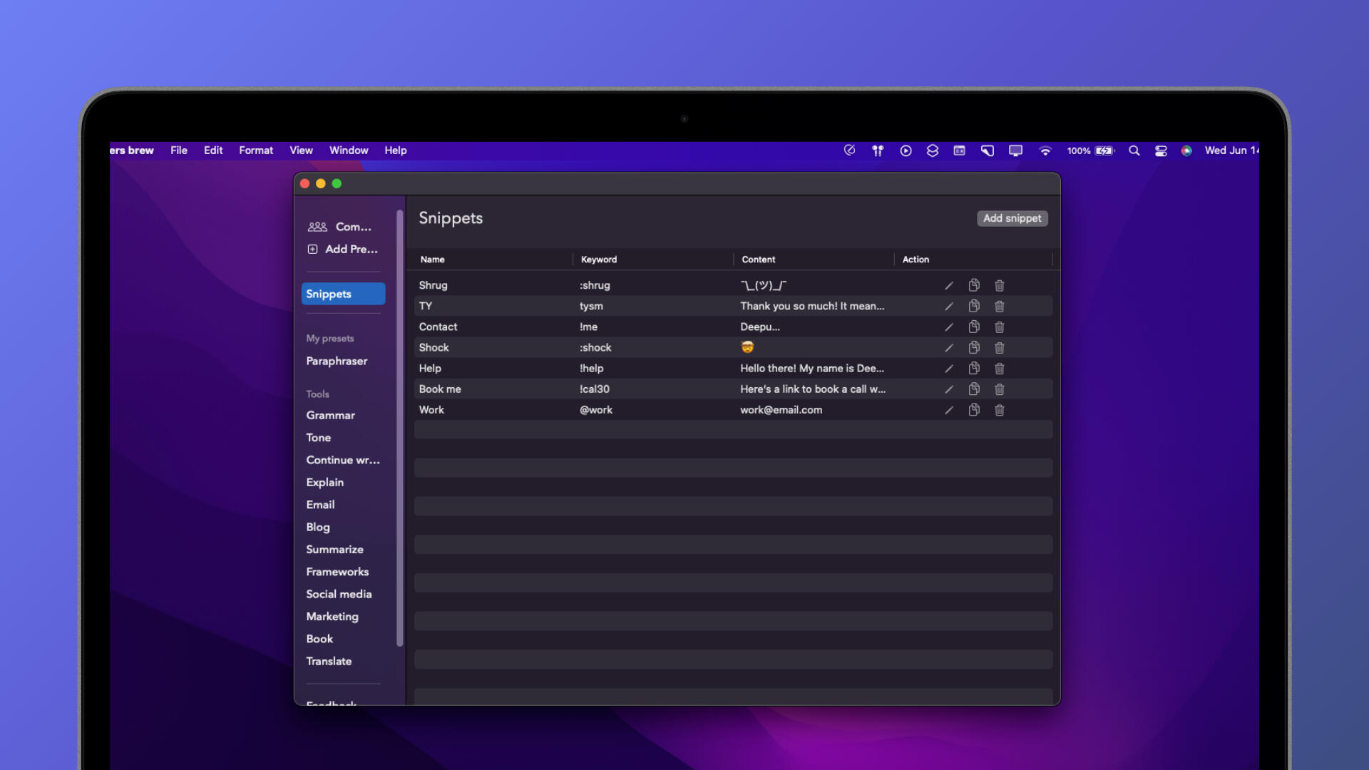 You can install following snippets in PopClip by highlighting the text with your mouse and then tap install from PopClip